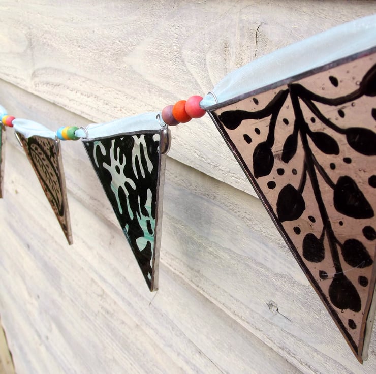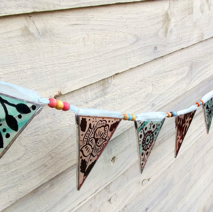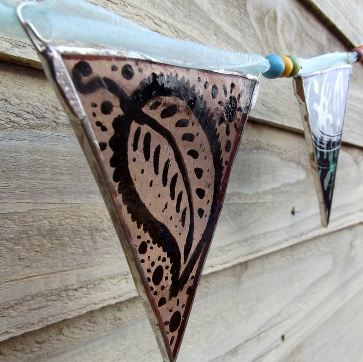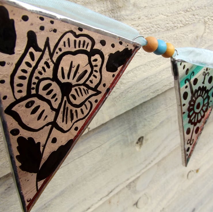Perfect summer bunting, wedding decoration or to decorate a feminine room. 8 dusky pink/mauve and aqua/clear swirl stained glass flags hand painted with kiln fired glass paint. Each flag is decorated with folk/gypsy style floral and leaf designs which were inspired by Indian fabric patterns.