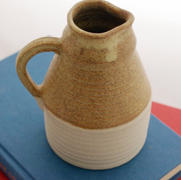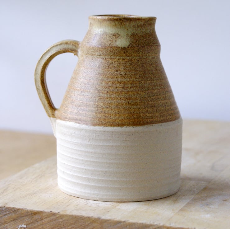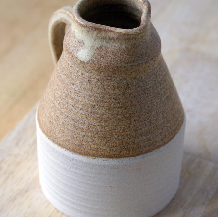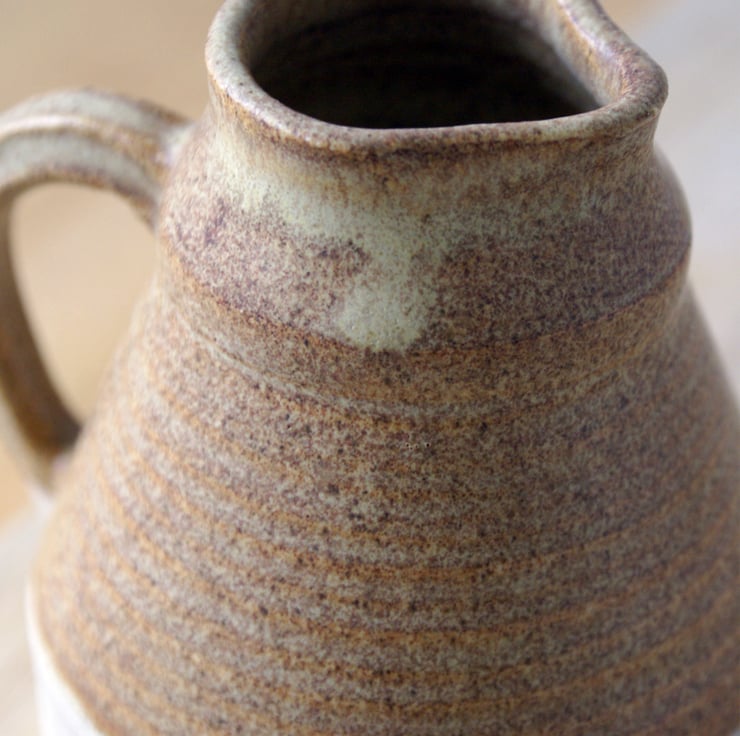 Glazed in natural brown this gives the piece a woody look and statin finish ideal for the rustic kitchen. A portion remains unglazed so you can feel the sandy texture of natural clay. The narrow opening was delicately created by collaring the clay as it was being thrown, there's also a small lip to provide a steady flow.