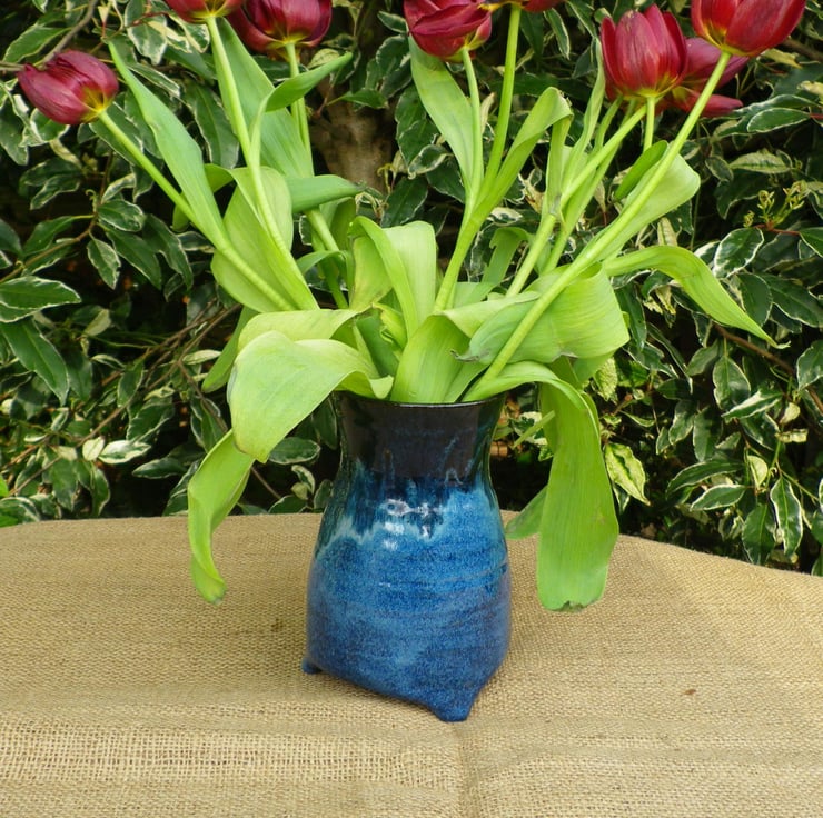 I threw this vase on my pottery wheel using strong white stoneware clay and, while the clay was still damp, altered the shape of the base into a set of three feet..