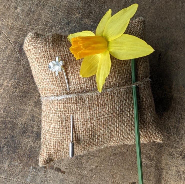 This flower pin can be attached to clothing, the stem threads through and is fastened with a simple push on stopper. The Daffodil itself measures 13mm across and the pin is approx 60mm long.
