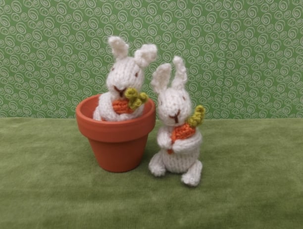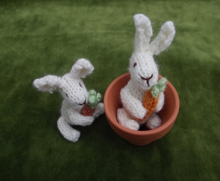 Hand knitted rabbit in terracotta pot,holding a knitted carrot,