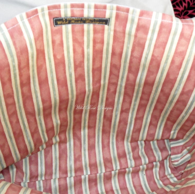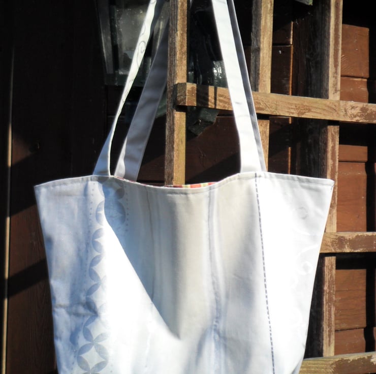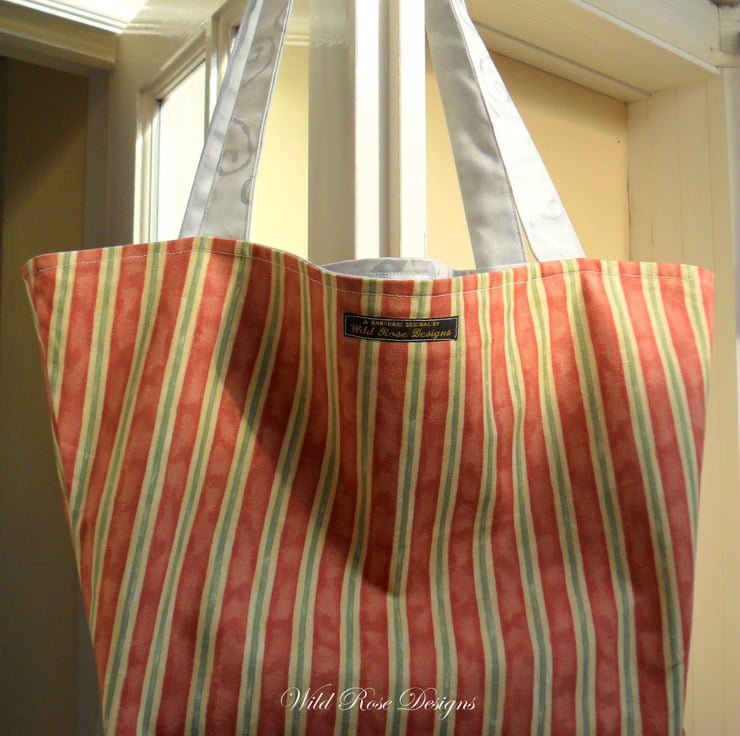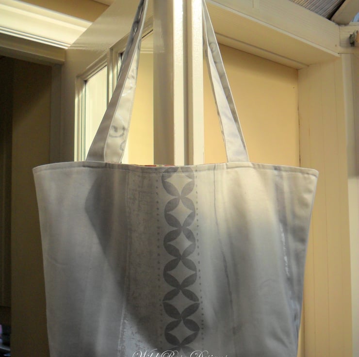 This sturdy shopper is made in a silver grey cotton print and is fully lined and interlined. The lining is a striped cotton, and the handles are long enough to fit comfortably over your shoulder. This tote is completely reversible!
