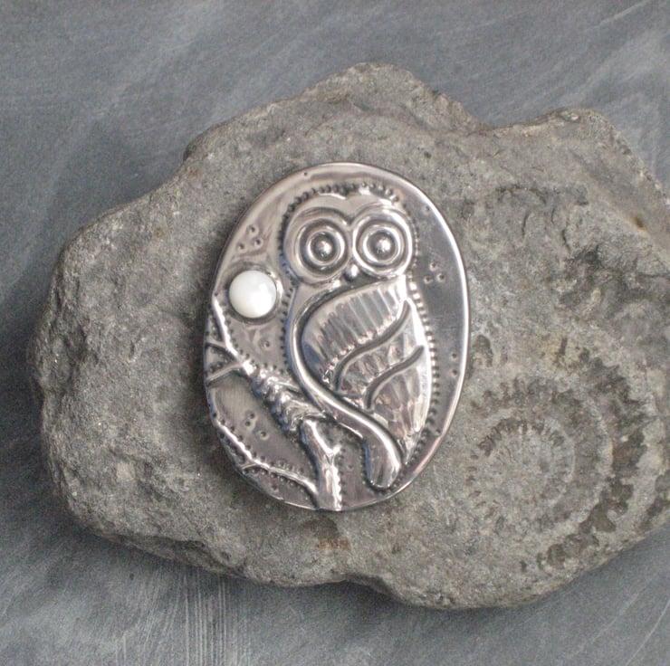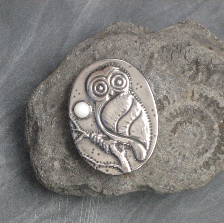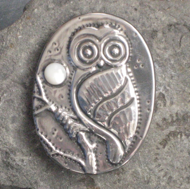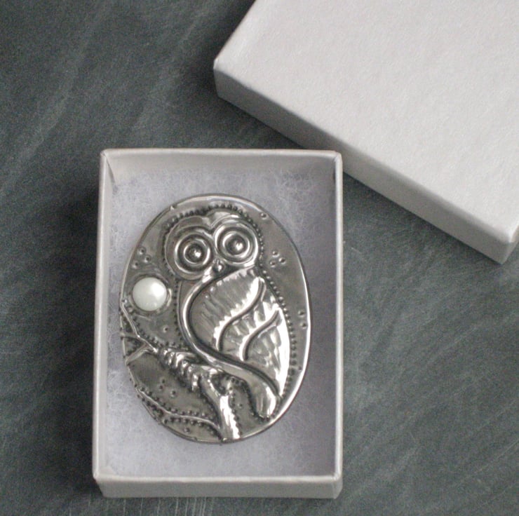 This little character sits beneath a mother of pearl moon, and has been handmade in modern lead-free pewter. Measuring 44mm x 33mm, it has a a 25mm pin with safety catch.