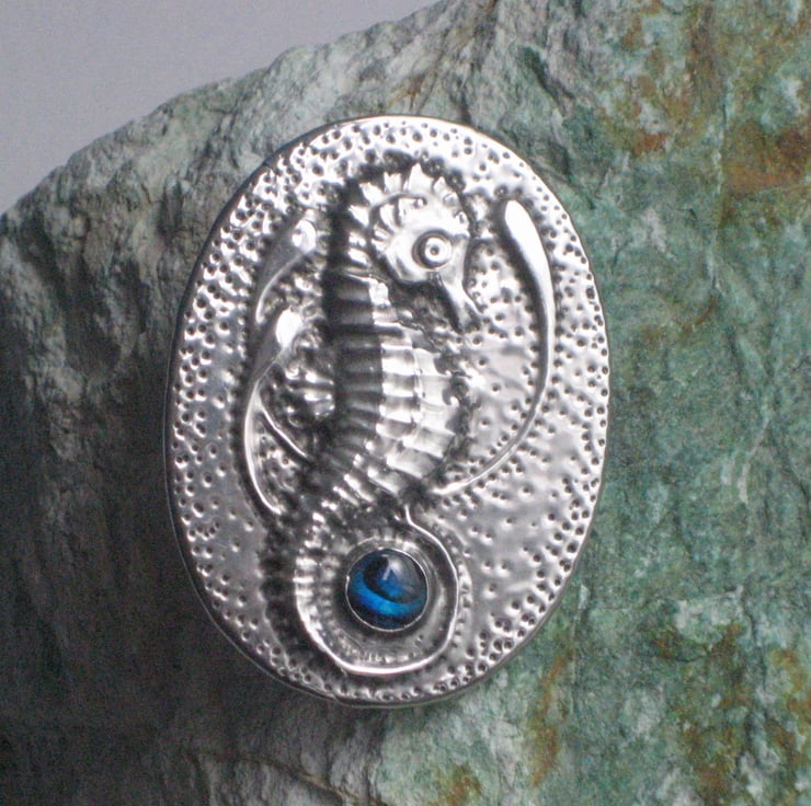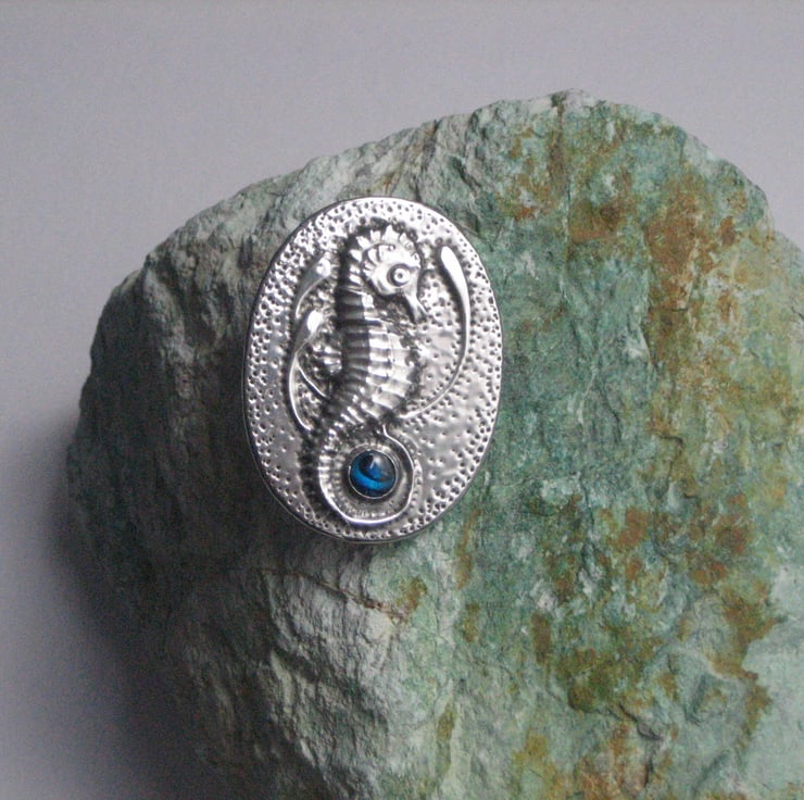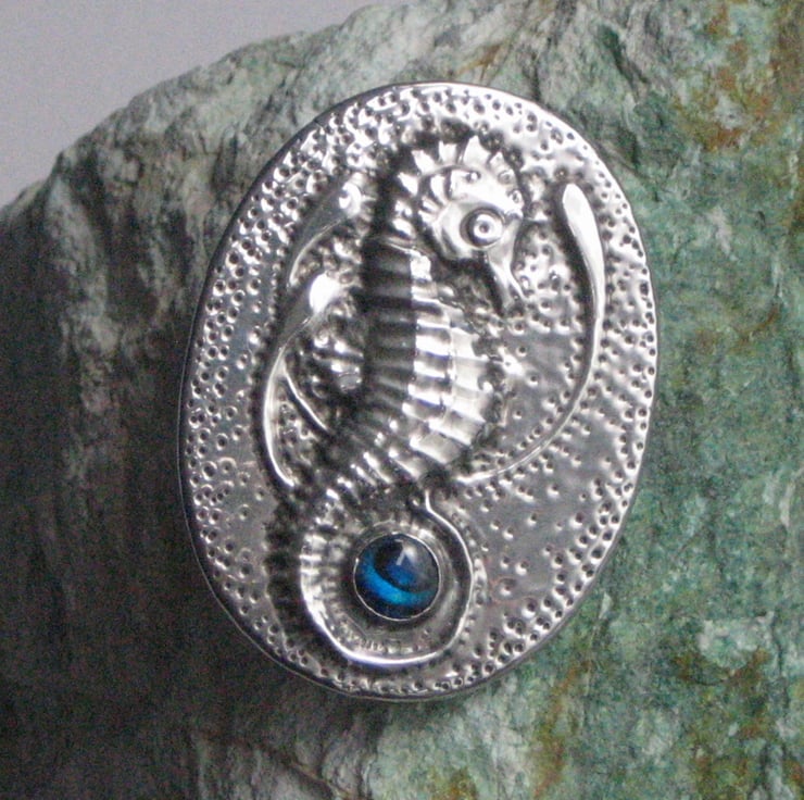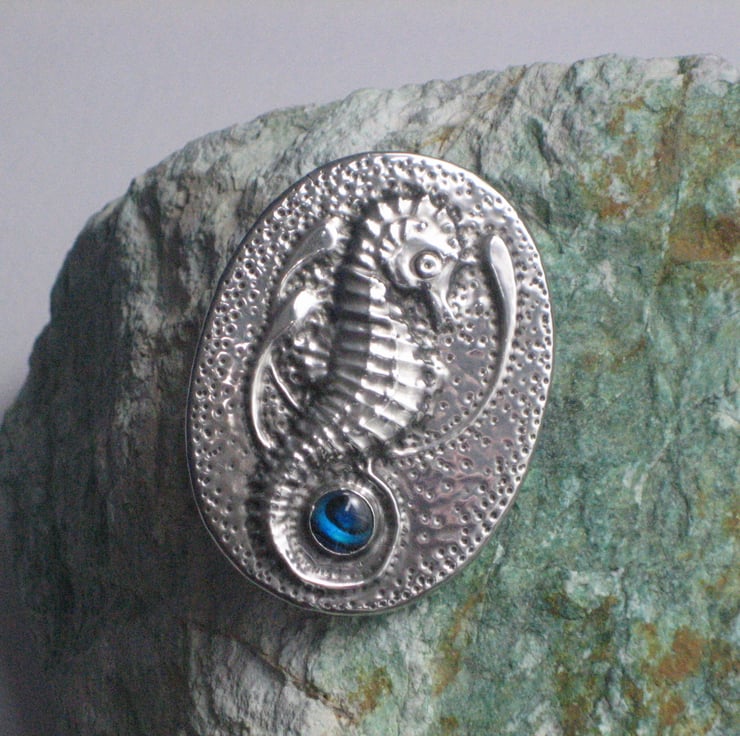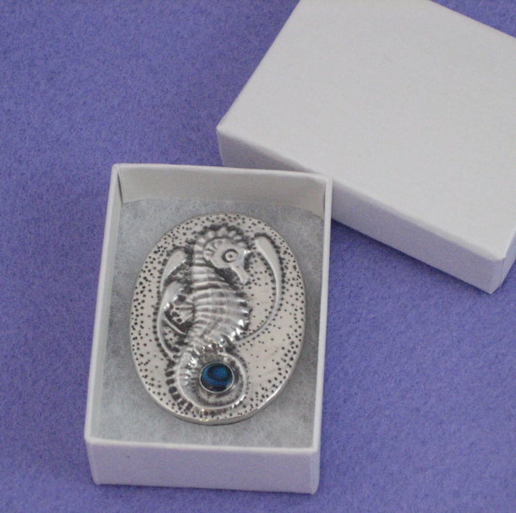 Reduced! Usually £15, now £8. This brooch has been individually hand-made in shiny lead-free pewter, and measures 45 x 34mm.It features a blue paua shell cabochon. It has a 25mm pin with safety catch on the reverse, and comes in an attractive gift box. I have reduced it from £15.00 to £8.00 as it has two minor faults- there is a tiny (barely noticeable) split in the metal at one edge, and I accidentally put the pin on upside down, so that it points up instead of down ( not a great problem, just unconventional!) A great gift for a 10th Wedding Anniversary, Mothers' Day, Valentine's Day or Birthday.