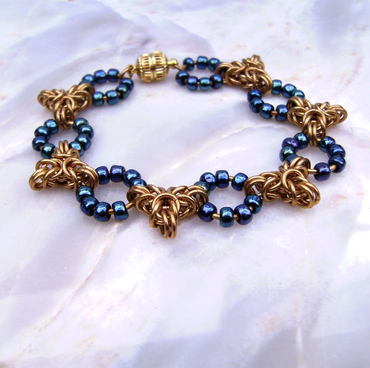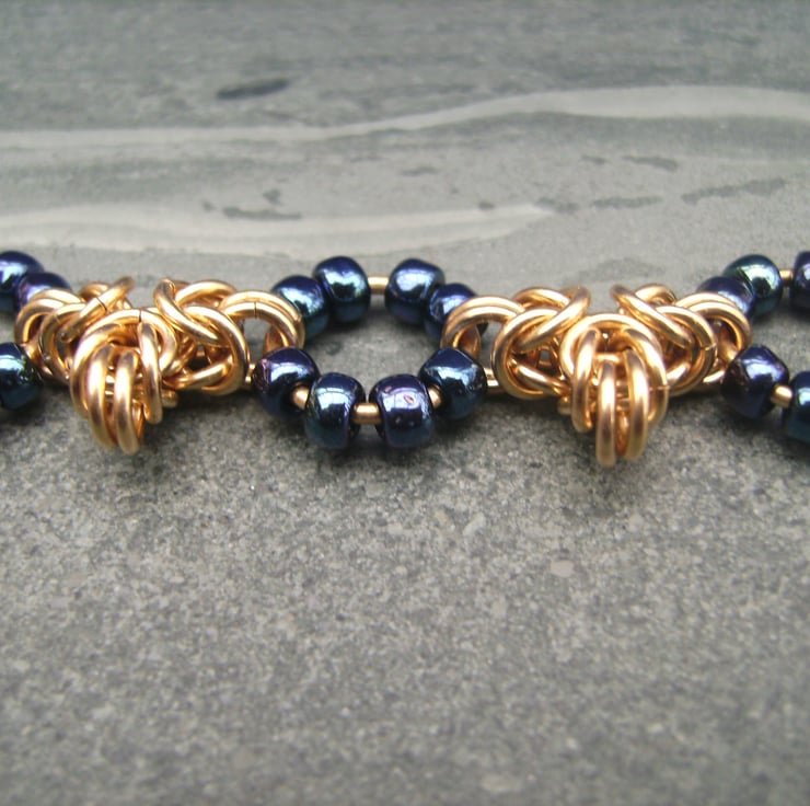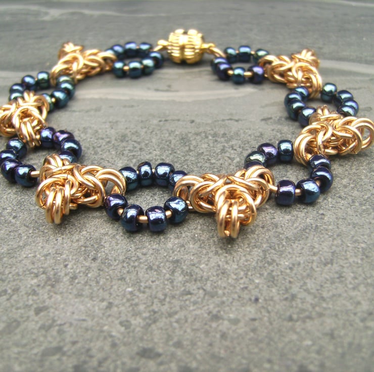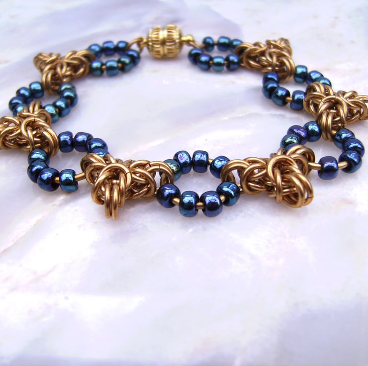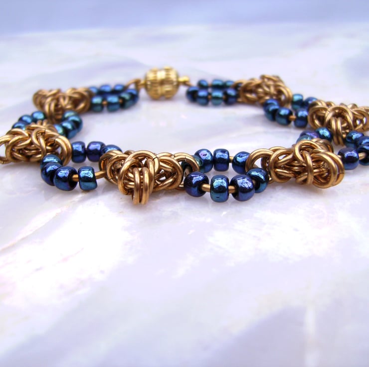 This 7.5 inch chainmaille bracelet has been created with jewellers brass jump rings & navy blue toho beads. It is completed with a gold plated magnetic clasp & will be sent in a velveteen gift bag. Please remember I am happy to create customized items if you want something similar. Just message me.