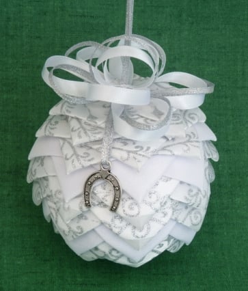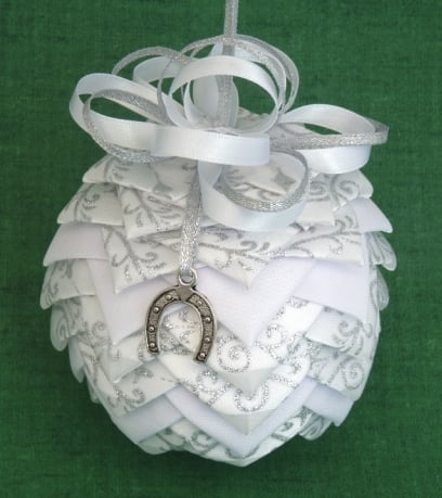 This beautiful White and Silver Ribbon Ornament is made from White/Silver printed ribbon and plain White. It is pinned onto a polystyrene ball with small sequin pins. It is then tastefully decorated with a fancy bow on the top using contrasting ribbons. It's then finished off with a lucky Horse shoe charm attached to one side. Its ideal for Weddings.