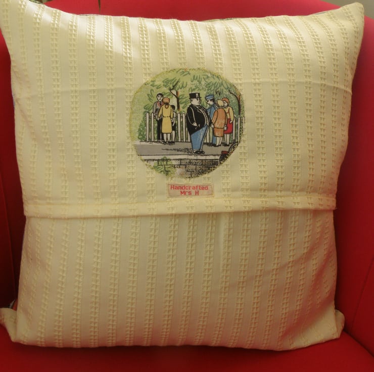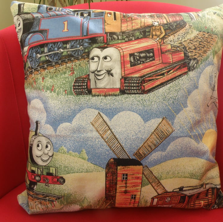 Thomas the tank Engine and friends print cushion cover. The front of the cover is made from vintage Thomas the Tank Engine fabric and the back is yellow cotton with an envelope closure. The cover is fastened with velcro . Each cushion is individual with a different front picture and a different complimentary applique of one of the characters on the back. The cushion pads are made from 100% polyester and are non- allergenic. Each cushion measures approximately 40cm square