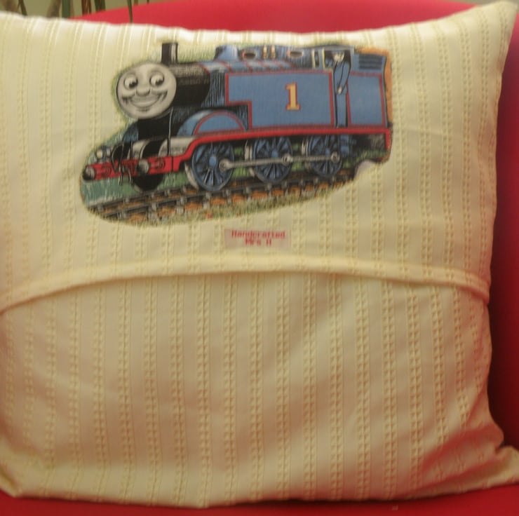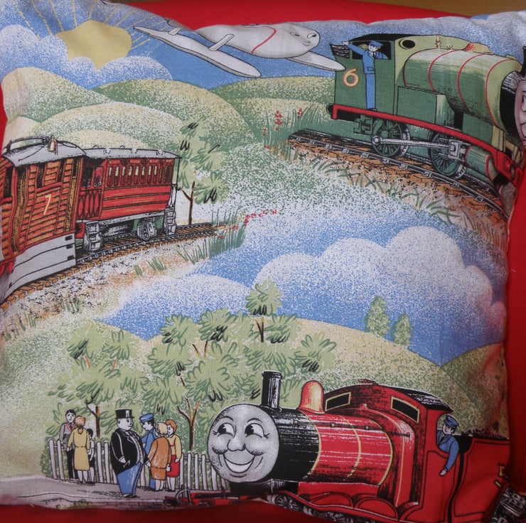 Thomas the tank Engine and friends print cushion cover. The front of the cover is made from vintage Thomas the Tank Engine fabric and the back is yellow cotton with an envelope closure. The cover is fastened with velcro . Each cushion is individual with a different front picture and a different complimentary applique of one of the characters on the back. The cushion pads are made from 100% polyester and are non- allergenic. Each cushion measures approximately 40cm square