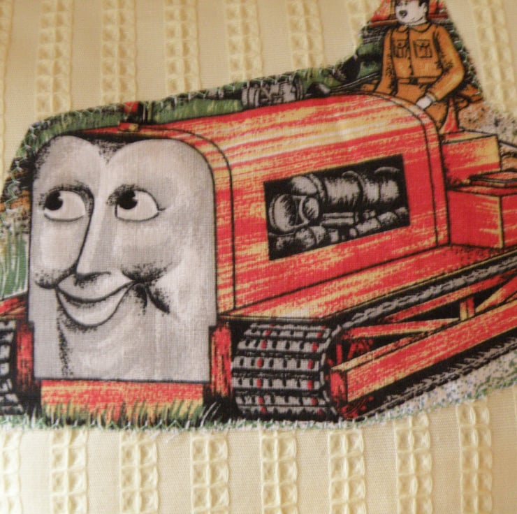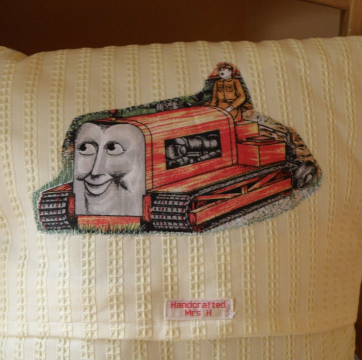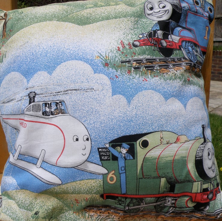This is a listing for a lovely vintage train print cushion cover as depicted in the photo and non allergenic pad. The front of the cover is made from vintage train print fabric evocative of the steam era and the back is yellow cotton with an envelope closure. The cover is fastened with velcro . Each cushion is individual with a different front picture and a different complimentary applique on the back. The cushion pads are made from 100% polyester and are non- allergenic. Each cushion measures approximately 40cm square. What child wouldn't want one of these? - a real British classic!
