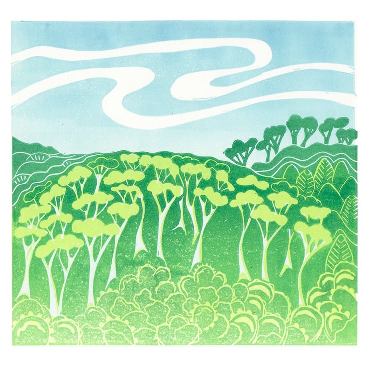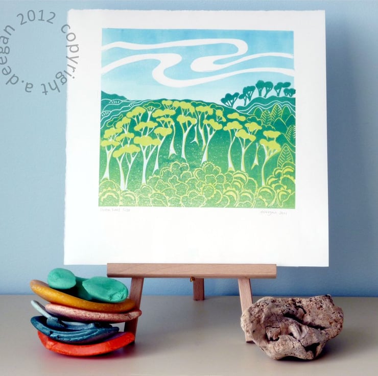 This is an original lino print printed from three individual blocks, one for the sky blue, one for the lighter green and one for the darker green blend. A limited edition of 30. The printed area measures 20x19cm, with a white border around for mounting. A custom cut mount is available, send me a message for costs.