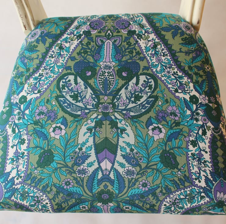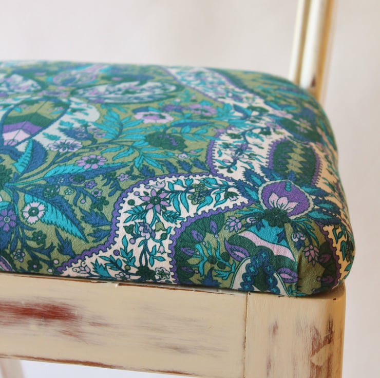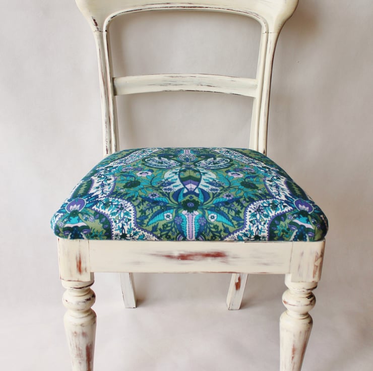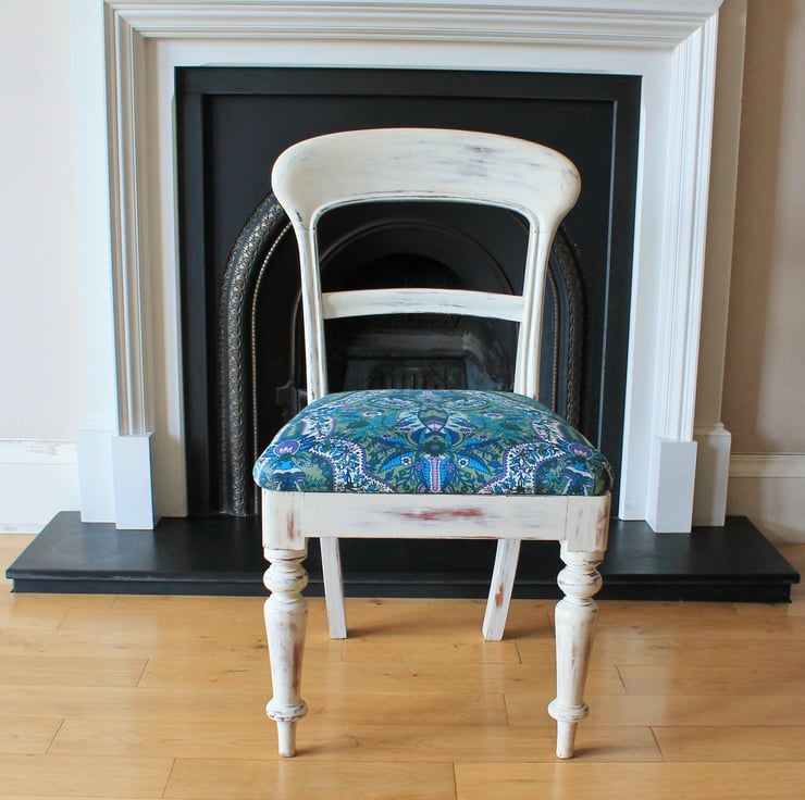 This is an original beech Victorian spoon or bar back chair, featuring an open back with a mid rail with moulded edges and turned front legs. It was found in a sad state, having been left in a shed in Scotland for years! It has now been lovingly restored: loose joints have been fixed, the woodwork has been renovated and the upholstery has been replaced. It has a drop-in seat that has been fully re-upholstered using traditional methods, being covered in a beautiful piece of vintage satin cotton fabric, featuring a flower medallion in various shades of blue, green, purple and white. The woodwork has been updated by being painted white and sanded back in parts to give a distressed shabby chic look and to highlight the shape and mouldings of the chair. The white frame has also been given several coats of French polish and finished off by waxing.