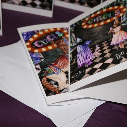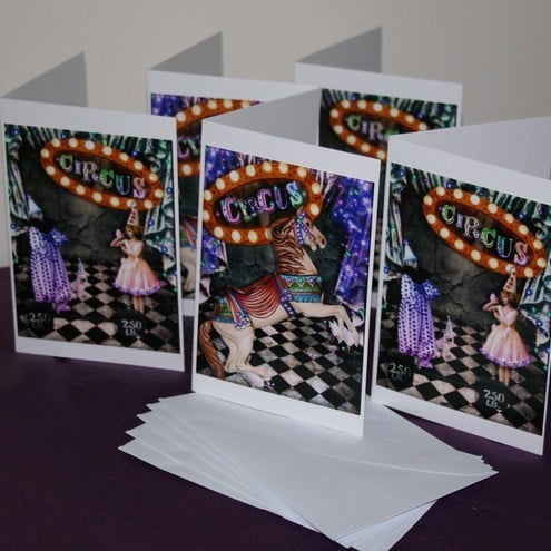 This card is blank inside,come with its own envelope and has a matt image of one of my own designs on the front.These images show my designs with a circus theme, one with a beautifully decorated horse and the other with circus performers with their weights.