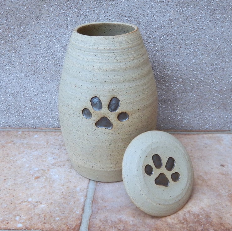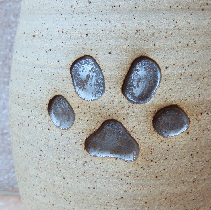 This handthrown urn is left unglazed in a natural rustic stoneware clay. I have highlighted the paw prints in bronze oxide.