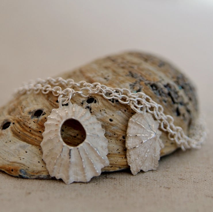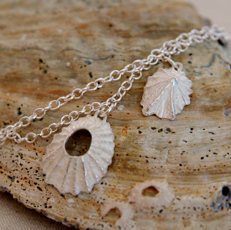 This double strand bracelet is handmade in sterling silver. The small limpet measures 12 x 17mm and the larger limpet is 18 x 23mm. The chain length is 20cm, but if you specify in your order it can be shortened or have an extender attached. The clasp is a 11mm lobster clasp.