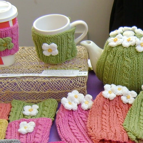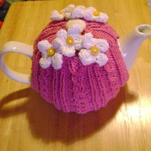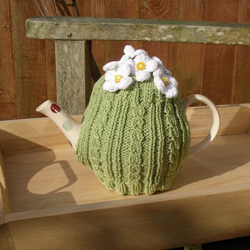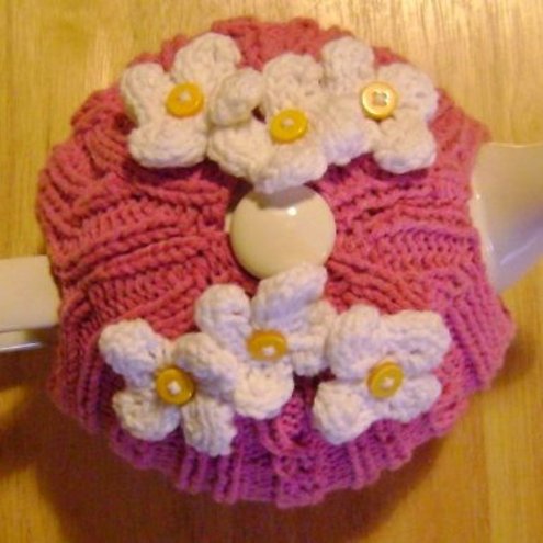 A pretty tea cosy hand knitted in a cotton yarn, with white daisy flowers and little yellow buttons. It fits a standard medium size teapot and is available in the following colours: