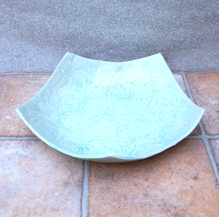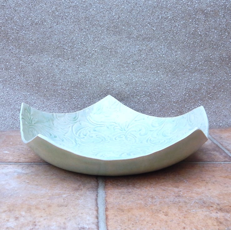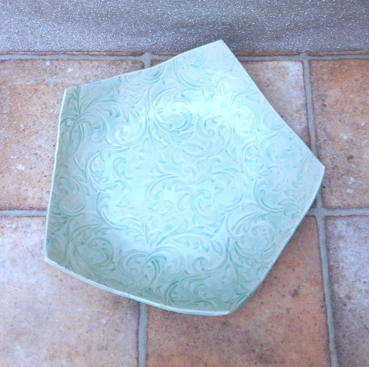 This pentagon shaped dish was made with a rolled out piece of strong white stoneware clay which I have added a William Morris style texture to.