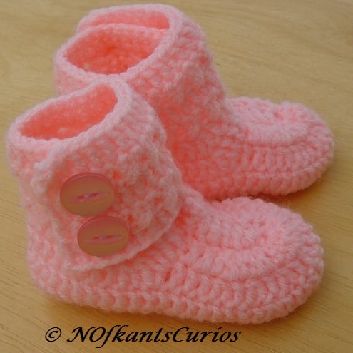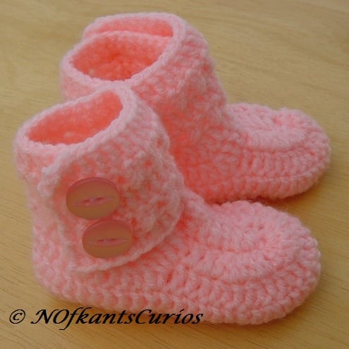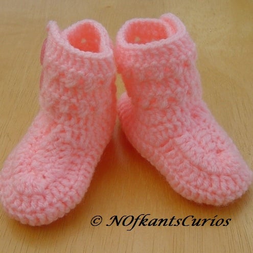 Bright Pink, hand crocheted baby girls ankle booties, with double button ankle strap.