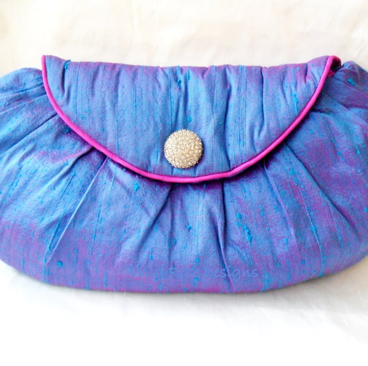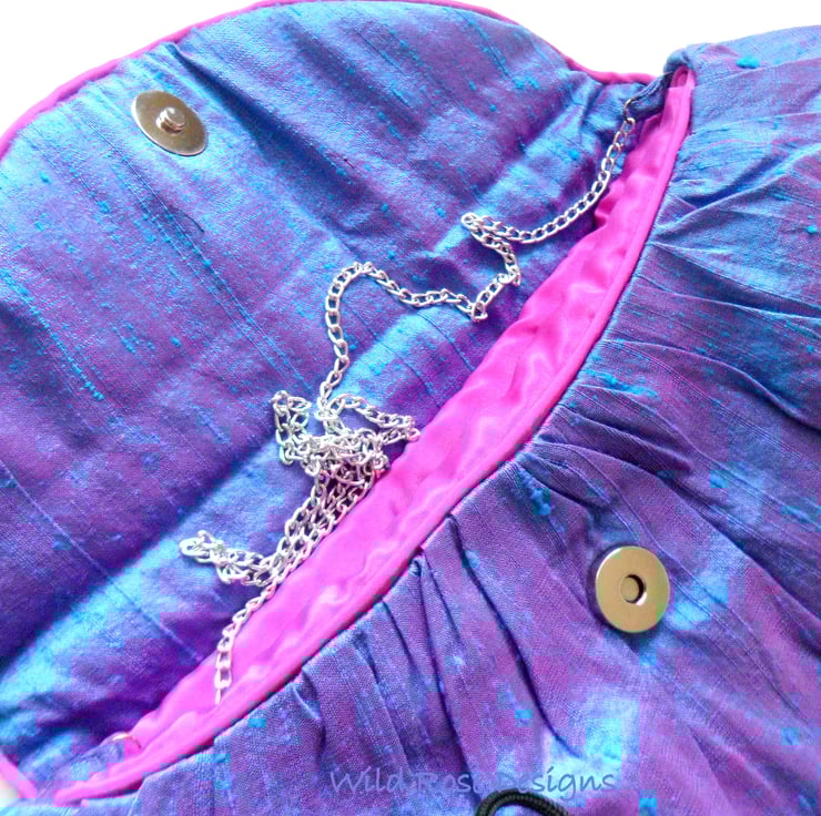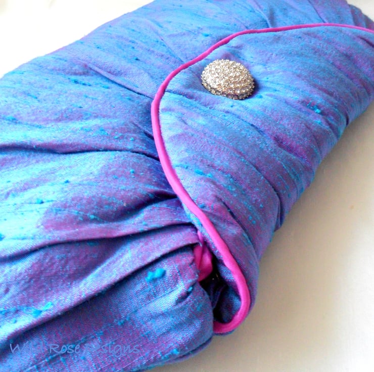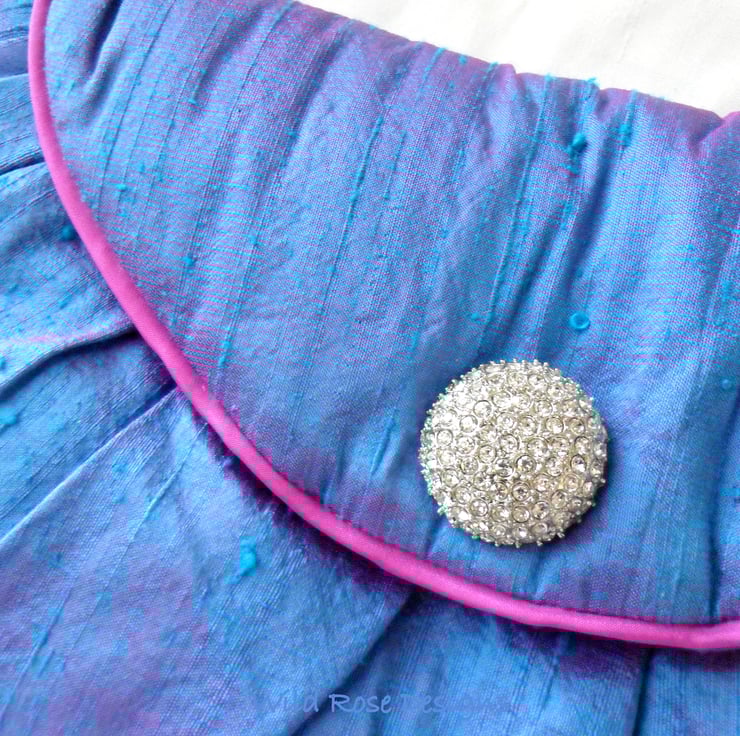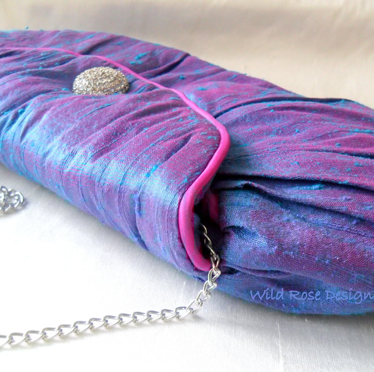 This lovely under arm clutch is made in a gorgeous blue silk dupion, with cerise piping and lining. Inside there are two pockets and it closes with a magnetic snap. The bag is finished off with a stunning diamante button. There is also a 50cm chain which can be tucked inside when not in use.