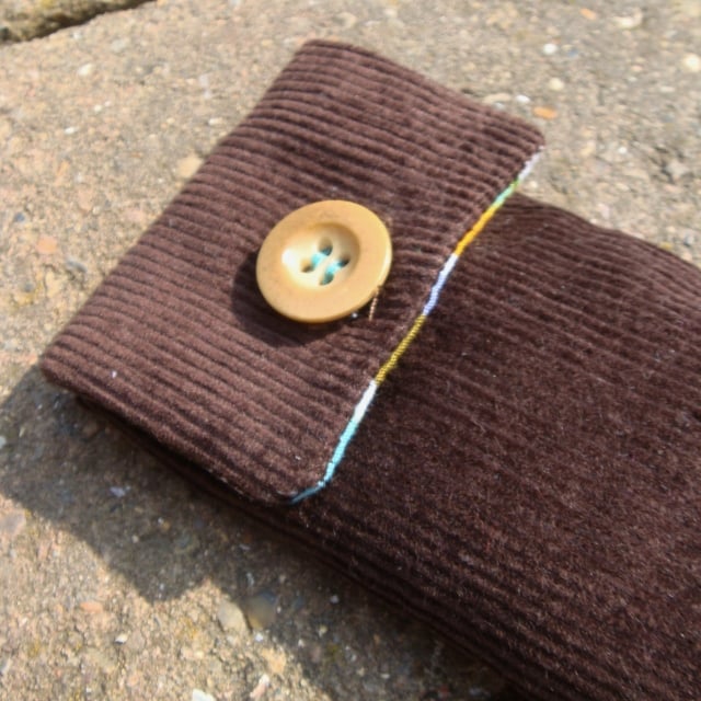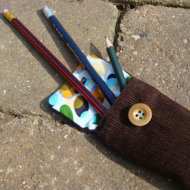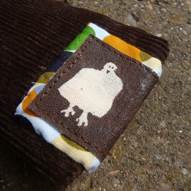 This pencil case is made from durable chocolate cord with a cheerful patterned fabric lining, which is echoed on the back and front with my Pedro the Pigeon character motif. Machine sewn and hand finished