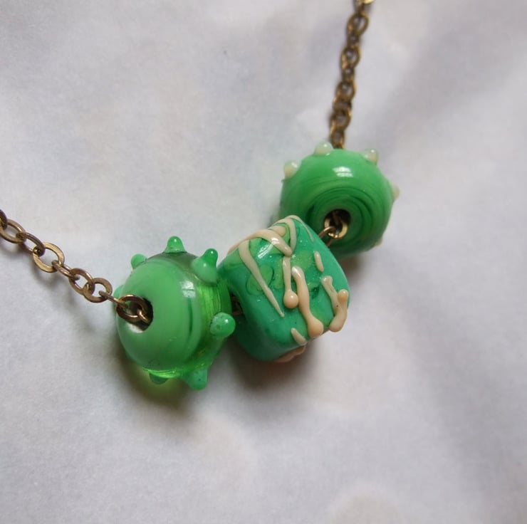 This necklace features three lampworked beads handmade by me. The beads are from my harvest range of beads, inspired by the appearance and textures of fruit and vegetables.