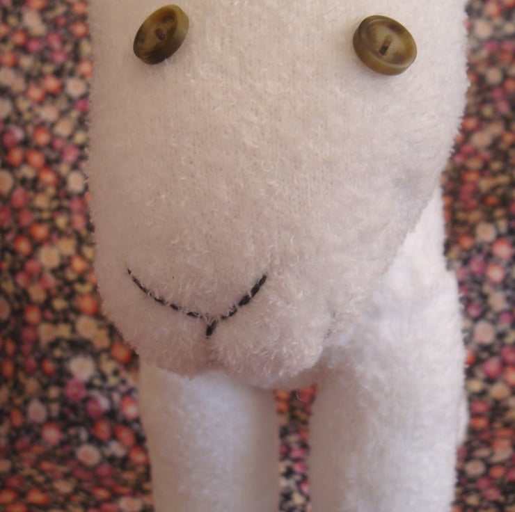 Made from a Nylon and polyester sock she is handsewn and filled with hollowfibre filling (which complies with the furniture and furnishings (fire safety) regulations 1988).