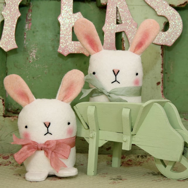 Here we have a cute little bunny, made lovingly by me out of soft Wool felt, he is stuffed with quality stuffing and also weighted with pellets(sealed in a pouch for safety).His cute face is hand embroidered. A nice little friend for a child this Easter. Each one is slightly different as they are hand made. Won't you give him a home. He measures approx 6 high including ears a perfect size to cuddle. This is for the white bunny with the pink bow, his friends are available in other listings.