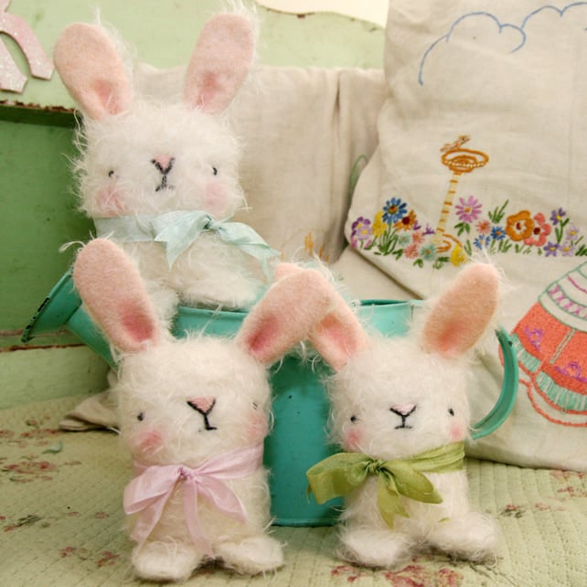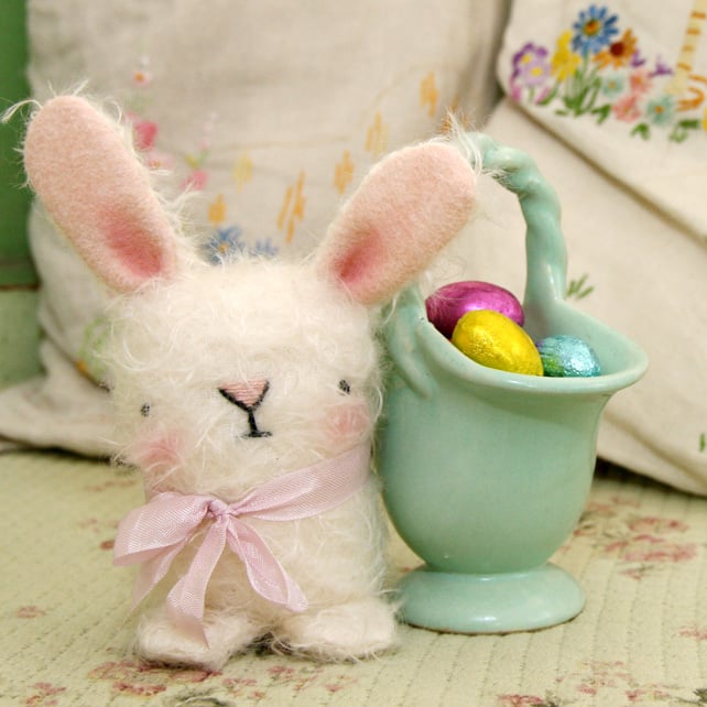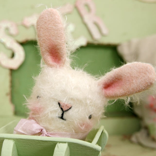 Here we have a very cute fluffy Bunny made from wonderful soft sparse curly mohair. He has wool felt lined ears and embroidered features. He wears a lovely pink bow. He is stuffed with quality stuffing and slightly weighted . He measures just over 5including his ears. Made by hand from my own design loopylala 2011. Not suitable for tiny children because of the long fur thanks.