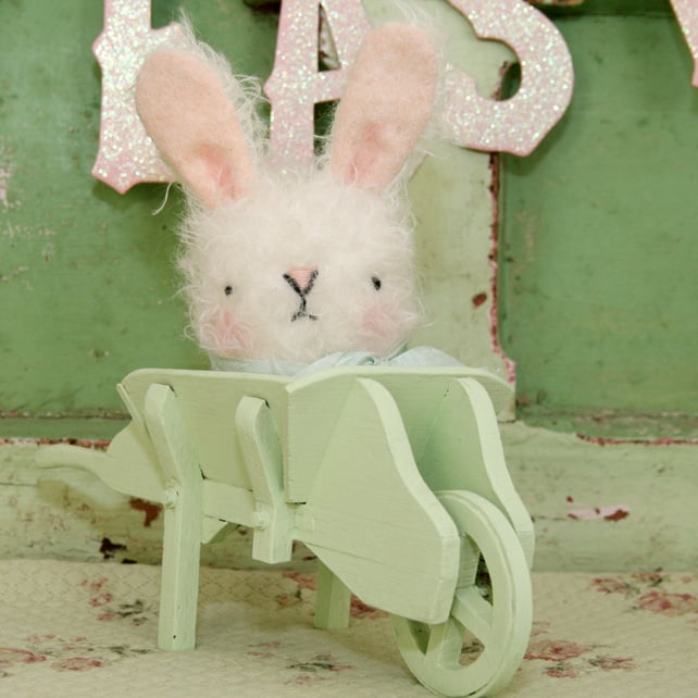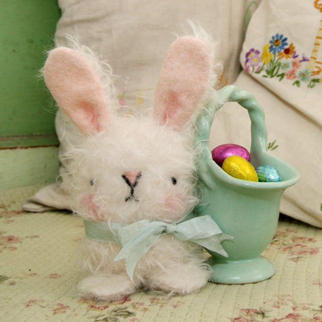Here we have a very cute fluffy Bunny made from wonderful soft curly mohair. He has wool felt lined ears and embroidered features. He wears a lovely blue bow. He is stuffed with quality stuffing and slightly weighted . He measures just over 6 inches including his ears a little larger than the other bunnies. Made by hand from my own design loopylala 2011. Not suitable for tiny children because of the long fur thanks.