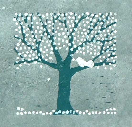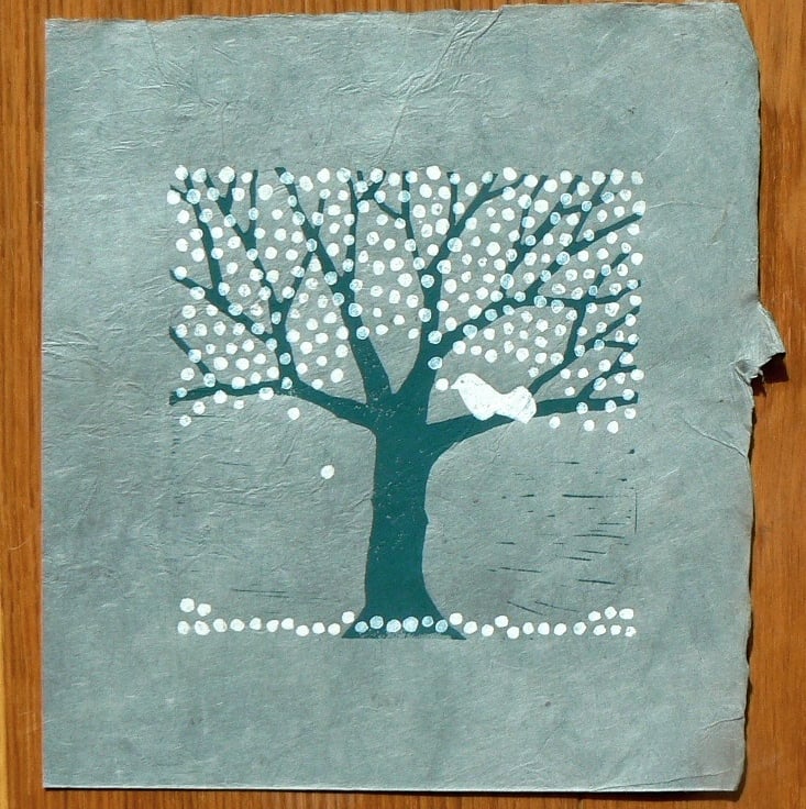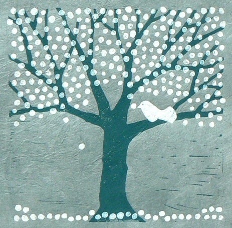 This lino cut is hand printed in two layers, on handmade paper, which is dyed a soft blue-grey. The image measures 15cm square, printed on paper 23cm square.