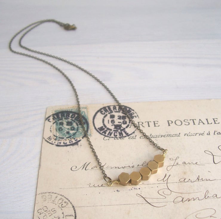 These little golden brass hexagons form a mini-row, placed on super fine chain. A beautifully simple and sweet necklace.