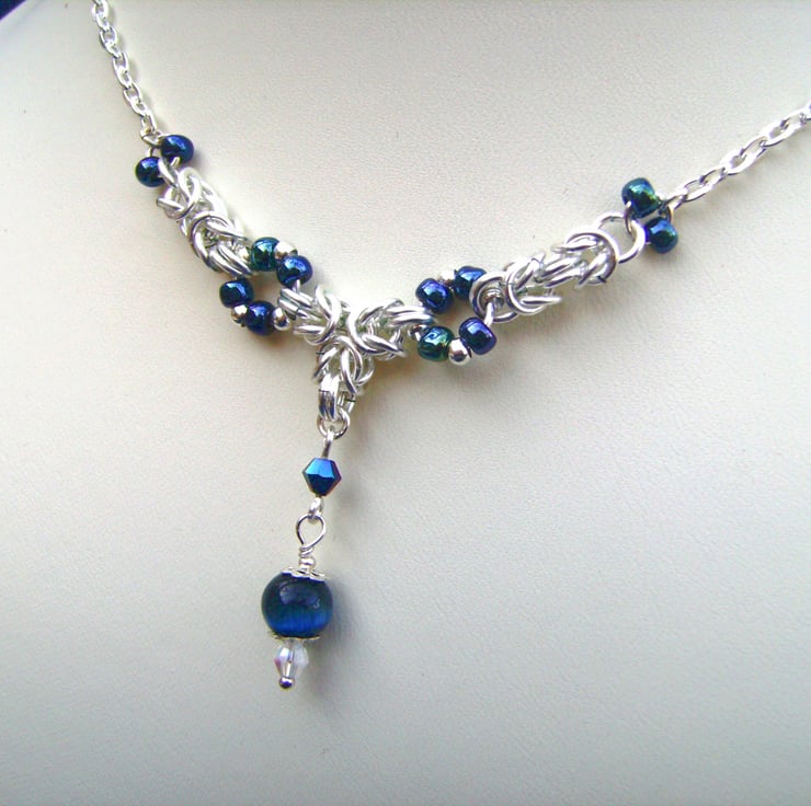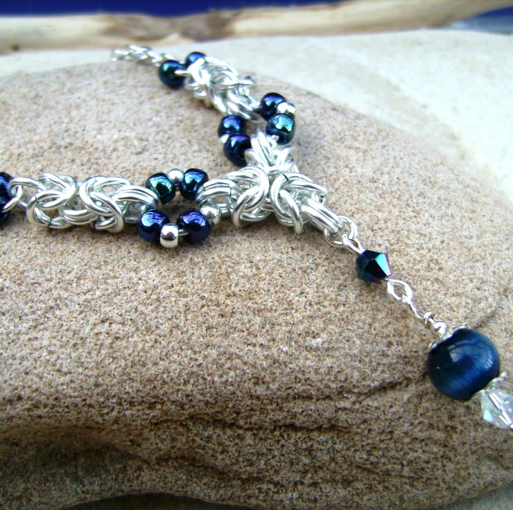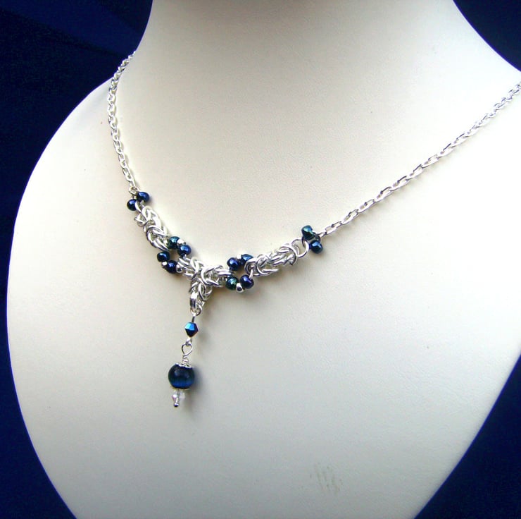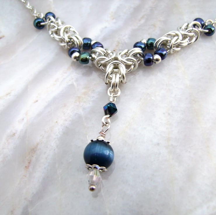 This 19 inch chainmaille necklace has been created using silver colour enamelled jump rings, silver plated chain, dark blue crystal beads & a cats eye bead. The chain length can easily be customized if you would prefer it to be shorter. It will be sent in a gift box.