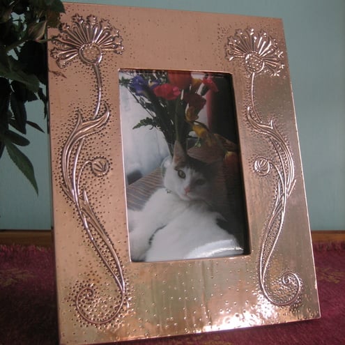 This frame has been hand-made in copper using the repousse method in the Arts and Crafts tradition. It has been patinated and polished to a rich antiqued finish.It measures 195 x 245mm and takes a 150 x 100mm photo.It has a stand on the reverse and a ring for hanging.