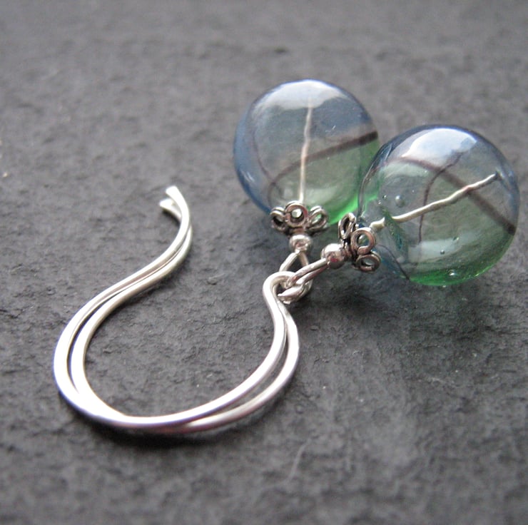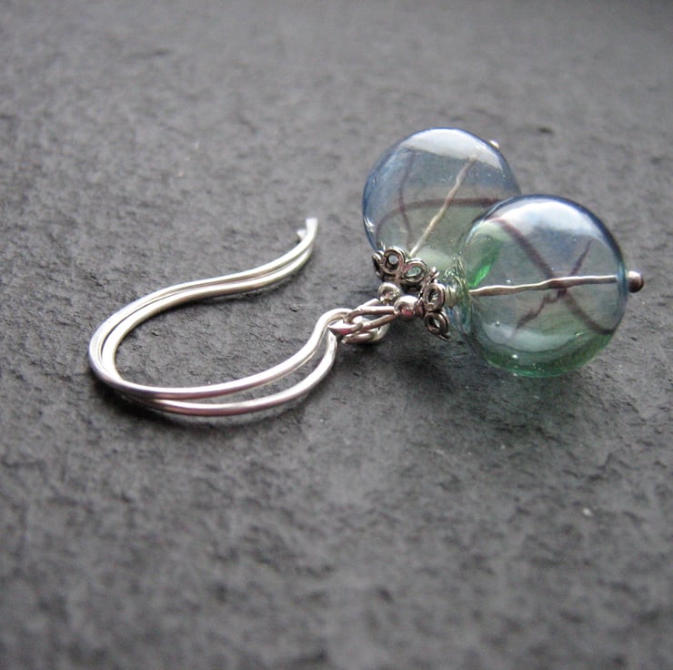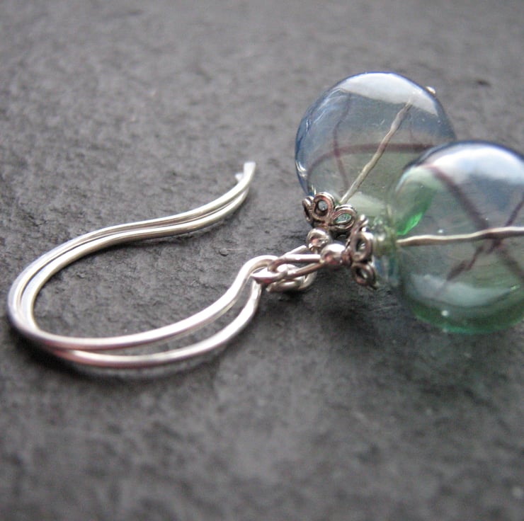 Blown glass beads of blue and green swirls drop from handcrafted sterling silver ear wires make these lovely earrings. Each ear hook has been hand formed from 0.8mm sterling silver wire before polishing back to a shine. They measure approximately 38mm from the top of the hook.