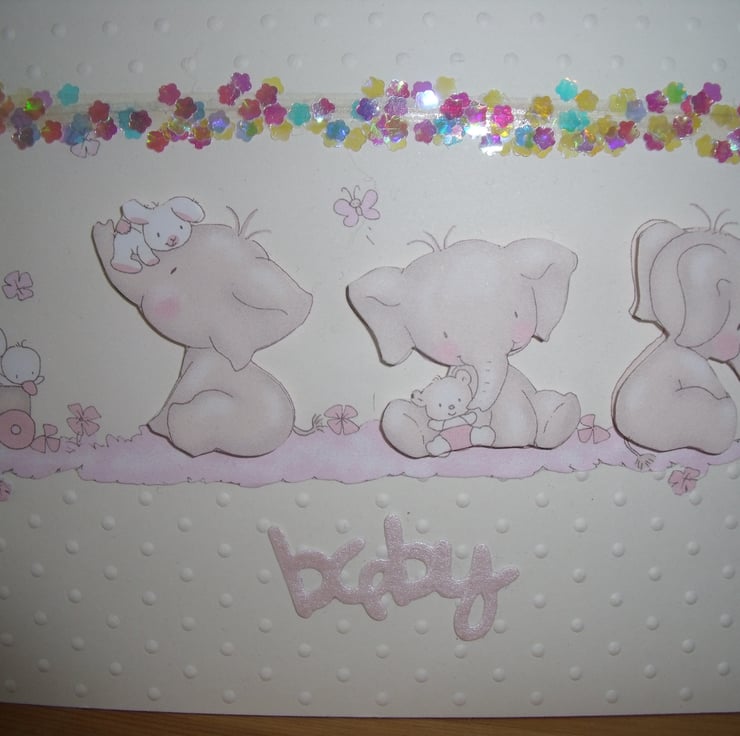 A very cute row of baby elephants, decoupaged onto embossed dotty card and embellished with iridescent tiny flowers. The word baby die cut from pale pink pearl card and mounted above the elephants and all mounted onto quality cream card.