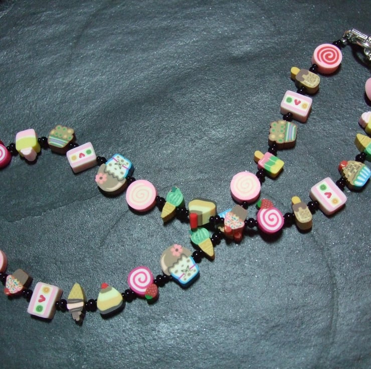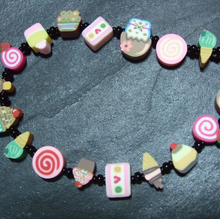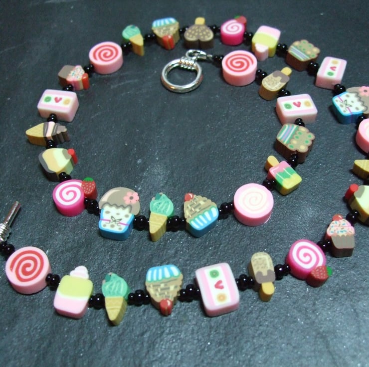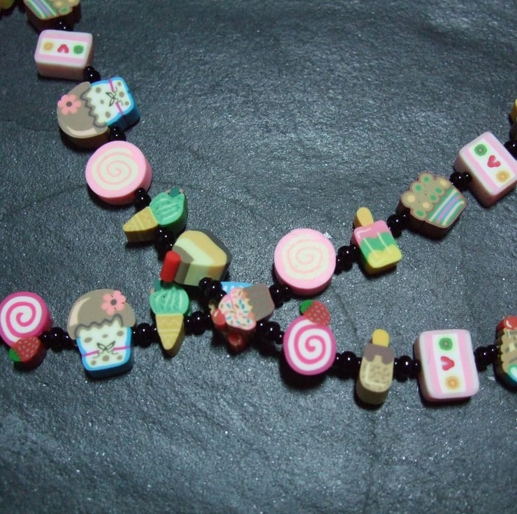 A cute, whimsical necklace from the Kitsch Creations Pick n Mix Collection, this item is lovingly constructed using miniature candy-themed polymer clay canes in pastel shades off-set to dramatic effect with the simplest black seed beads and high quality black plated metal jewelry findings. The random selection of candy canes used in this design means that each of these necklaces will be a unique one-of-a kind creation full of vibrant color and bound to attract attention! Yours will be similar to the one pictures, though not completely identical.(NB Photograph shows silver plated findings from an earlier version)