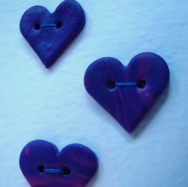 Handmade polymer clay (fimo) buttons.This cute set of five buttons is made from hot pink and deep purple polymer clay swirled together to make unique marble patterns, each button being a little different from its companions. Each button is about 1.5cm across and they can be washed at up to 40 degrees centigrade.