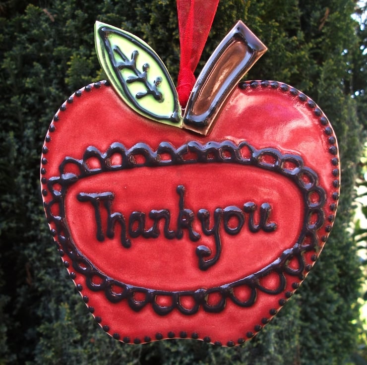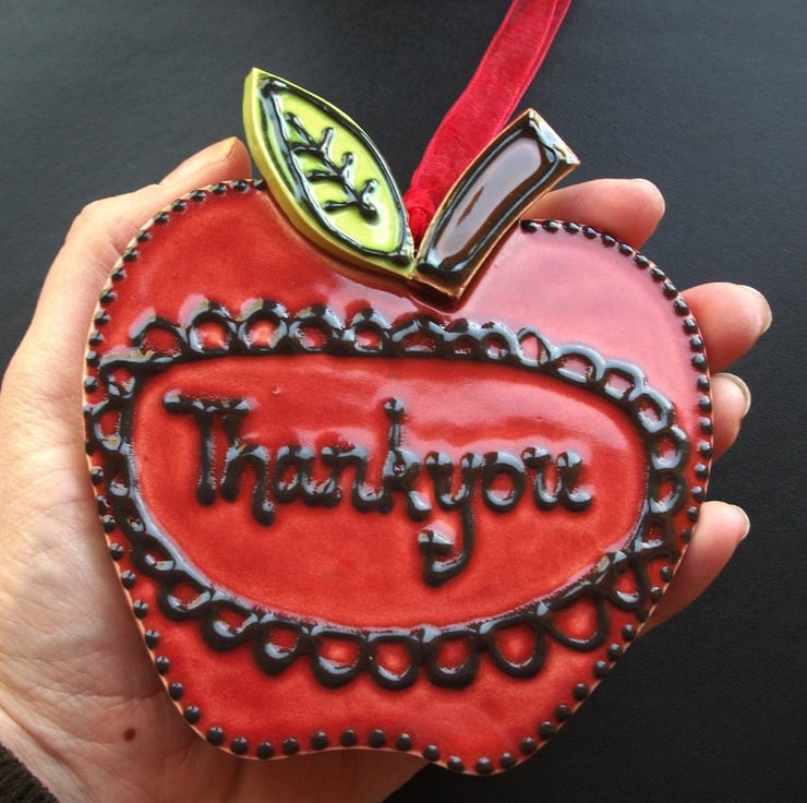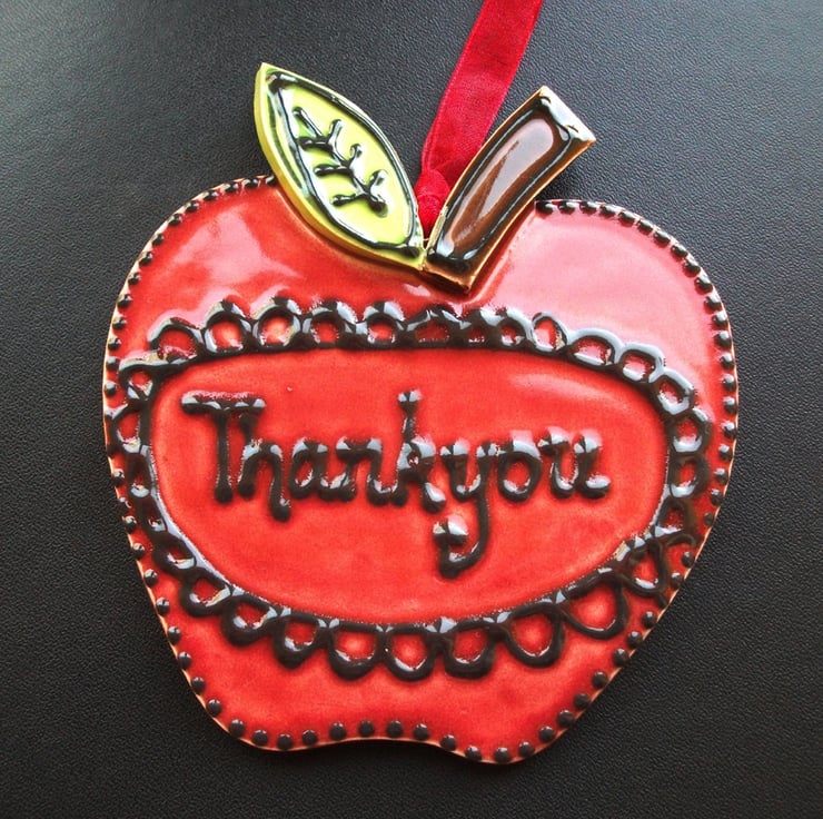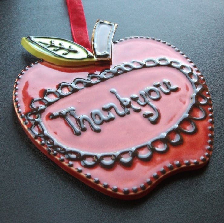 This mouthwatering red apple is made from white earthenware clay, handcut, decorated and fired. It is then glazed and fired again, so it is nice and strong.