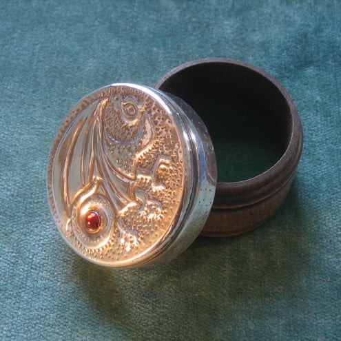 This little rustic wooden box has been transformed with a glittering lid hand-made from lead-free modern pewter,featuring a glowering dragon protecting a precious ruby (actually a foil-backed glass cabochon).It is 55cm in diameter and 40cm high