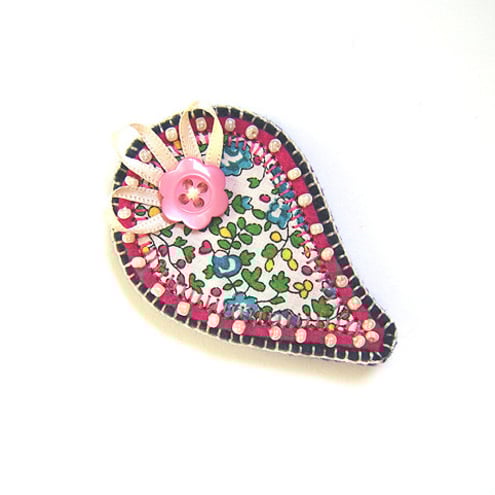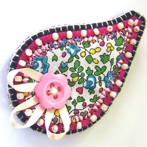 This is a lovely handmade Paisley brooch in pretty floral Liberty print fabric. It is appliqued onto fuchsia felt and is beautifully beaded around the edge with cream seed beads. It is further mounted onto a navy felt backing.