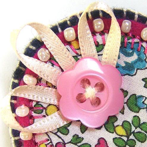 It is finished with a pretty ribbon and button detail and has a brooch backing for easy attachment.