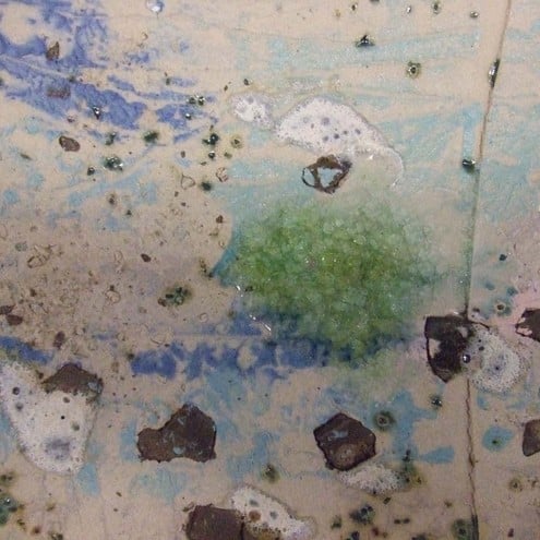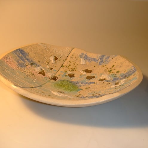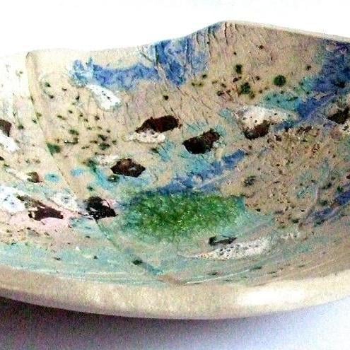 This bowl is approx 30cm long. It has been decorated using coloured slips, impressed textures, and melted glass in the bottom, which glimmers when attracted by the light. The exterior of the bowl is cream in colour.
