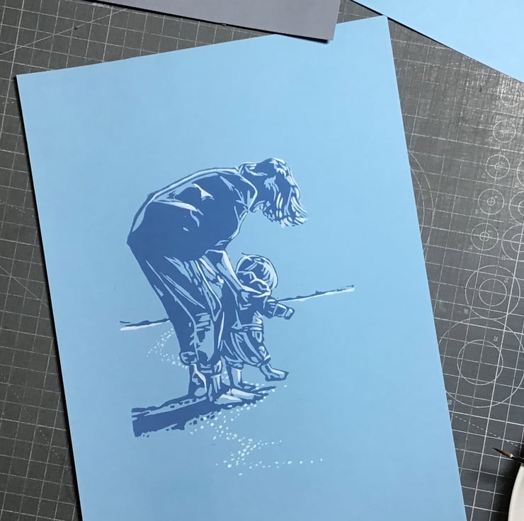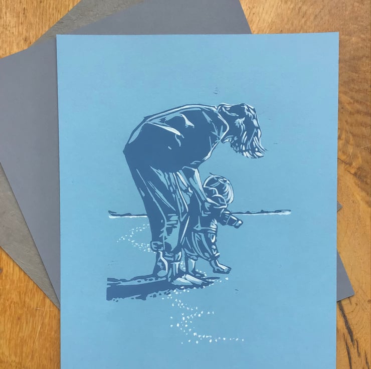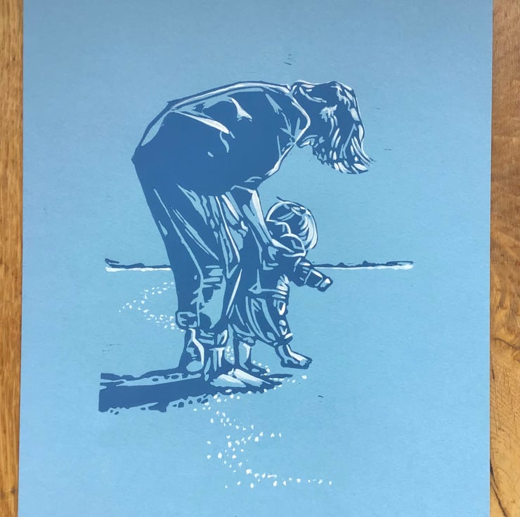 This version of Jane's lino print of our daughter's first paddle is hand finished with white ink, and shows the waters edge and a baby toe dipping in the cool early autumn sea.