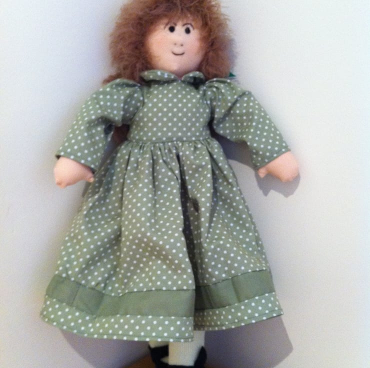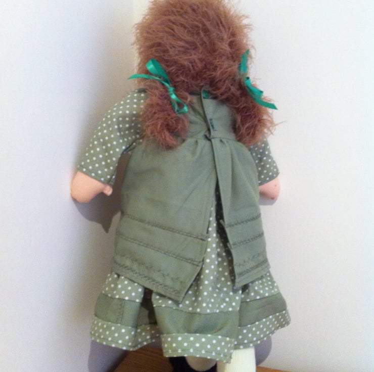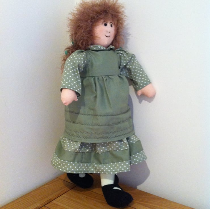 Nadine is a doll with a mind of her own. She's a bit of a tomboy on the quiet. She has soft brown hair tied back in pigtails and is wearing a sage green spotty dress with a green pinafore to keep her dress clean. (We can always hope!) The pinafore is embroidered in bands around the hem, sleeves and neckline but not in a fussy way because Nadine doesn't like to be too girly. She has pale green socks and soft black shoes. A right little character - as you can tell by her face!