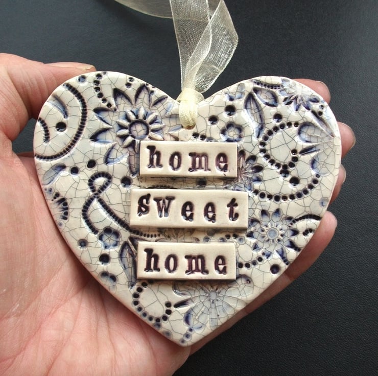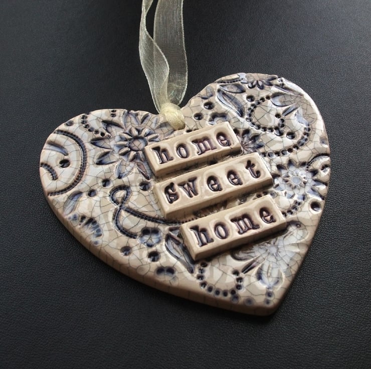 This ceramic heart is made from white earthenware clay and decorated with the words Home Sweet Home