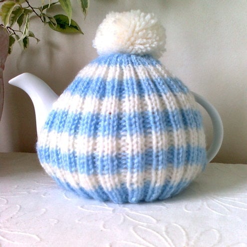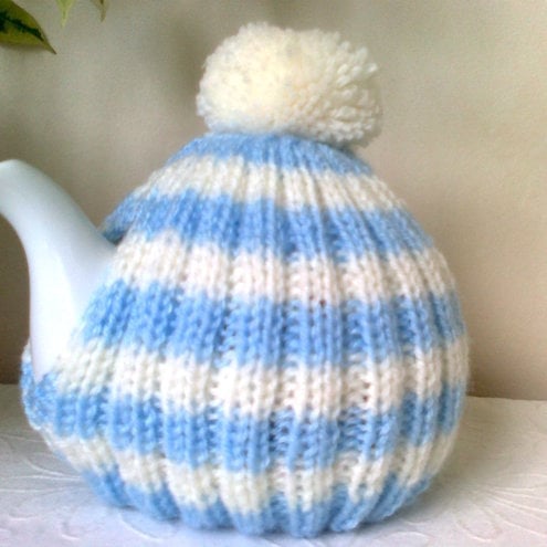 Fresh for spring a Blue and White Stripped Knitted Tea Cosy with a bobble on top. This one fits a medium 4/6 cup pot, but can be made in a 2/3 cup pot if wanted. Great for the tea lover in your life. The rib design allows it to hug your teapot so that its contents keep piping hot.