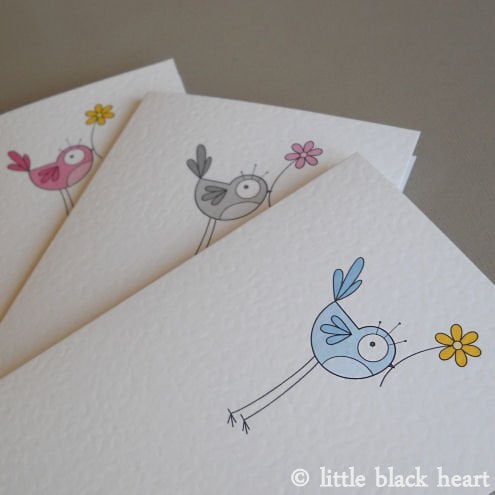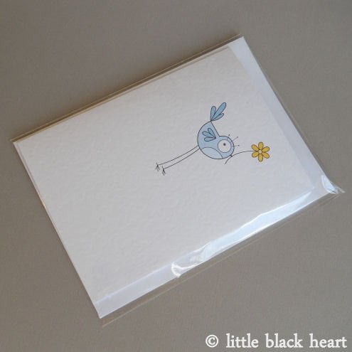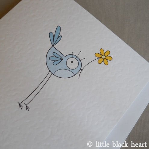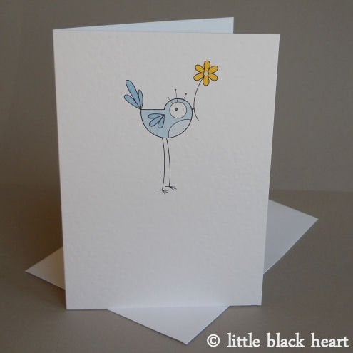 unique and quirky illustrated card featuring a cute blue bird. he is holding a bright yellow flower, just for you! could be used for any occasion: a thank you, a birthday, ...or maybe if you need to say sorry and make up!