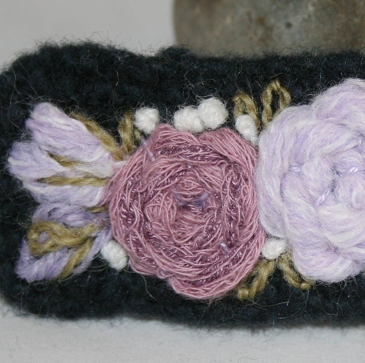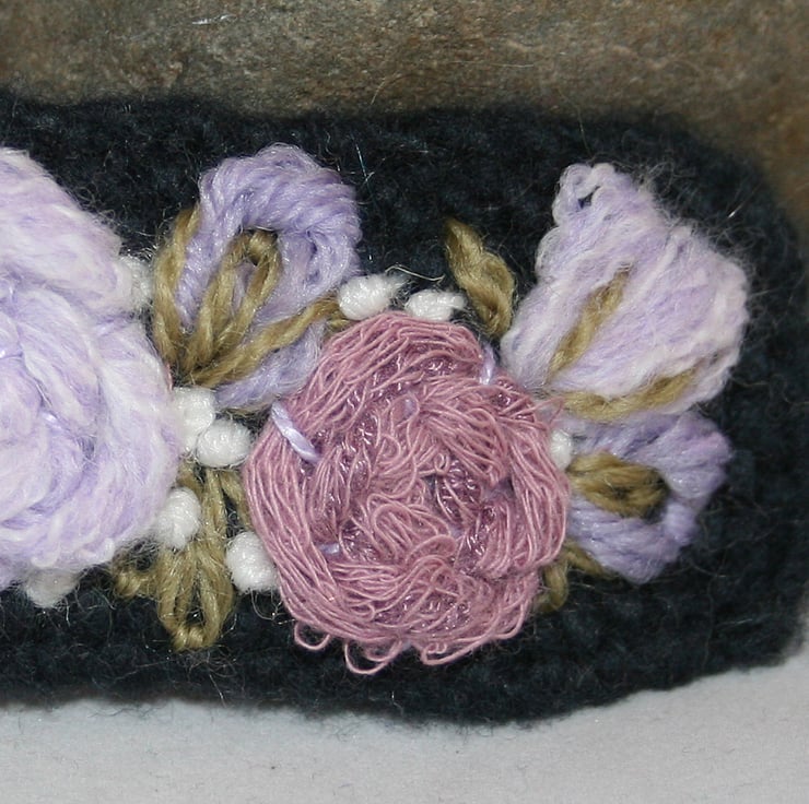 The background for this embroidery is hand knitted in a wool blend yarn in a dark charcoal colour. The yarn has an almost-felted texture before knitting. Moss stitch has been chosen to add texture to the design. The roses, leaves and gypsophila flowers are embroidered in knitting ribbons and tapestry wools using ribbon embroidery techniques.