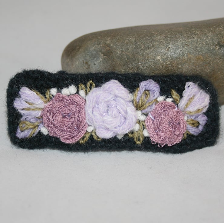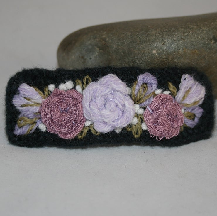 Beautiful roses are embroidered, in relief, onto this lovely hair barrette or hair slide.