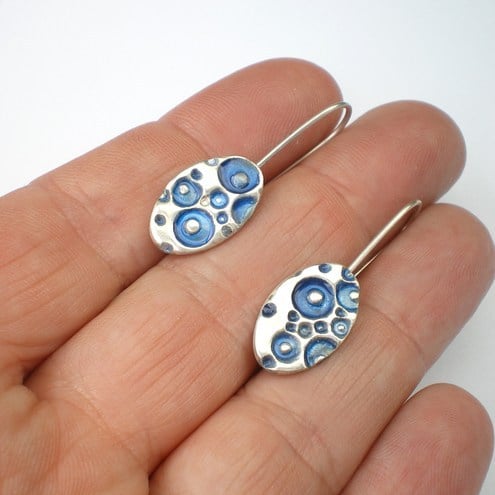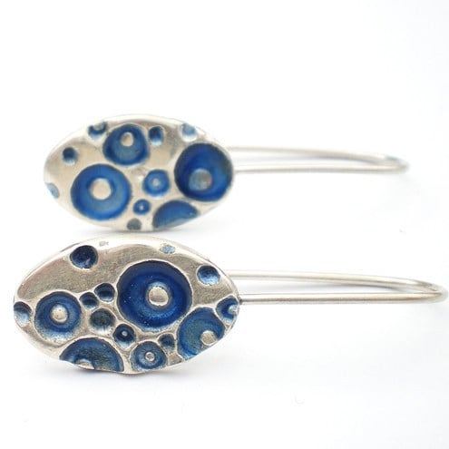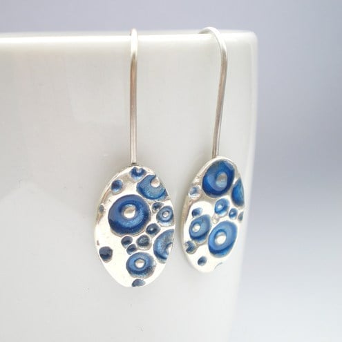 Little silver coral textured oval dangle style earrings with a colourful blue enamel. Inspired by nature, made from recycled silver making them a great eco friendly choice!