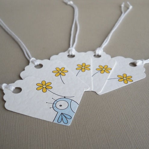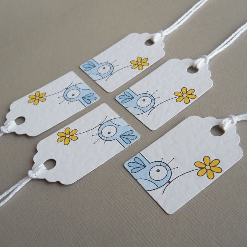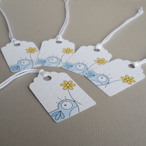 a pack of 5 tags, featuring a little blue bird holding a bright yellow flower. cute and quirky, and great to use for decorating, labelling or as gift tags.